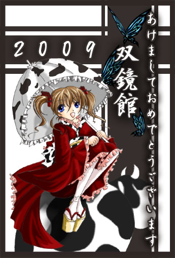 うし柄。着物自体と帯のどちらをするかと迷った結果、帯の勝ちな結果に 今年送った毎年のような目上の人向けの牛さんとメルヘンなイラストの牛のメルヘンの方です 時間がなかったもので、いろいろ手を抜いたわけで・・・背景が残念な感じです(汗 出した年賀状としては、市販であるパソに取り込んでする奴の背景とってきてくっつけましたが さすがにサイトあげるのにはね。消して無理やりです。 けど、思ったよりうし柄の帯と日傘いいかもと塗ってる最中思い、結構気に入ってたりします