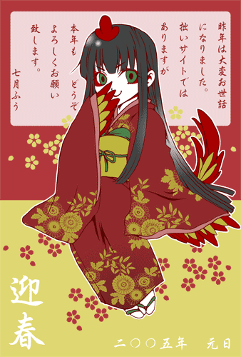 七月風samaから頂いた年賀絵 シンプルで、紅い着物に黒髪ですよ。 黒髪がまたいい〜っとなんだか自分の絵がかすむぐらいです。 惹かれて即お持ち帰りしてきましたよ。 素敵な年賀絵ありがとうございます。 戻る