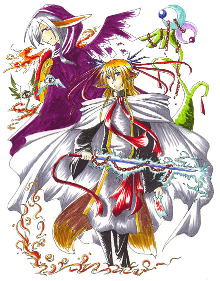 | 時は満ちた・・・ 二つの紅と蒼の月が空に昇るその夜 儀式を行う祭壇が月光で照らされ、祭壇に飾られた神具が鼓動し始める 二つの月を繋げる月人の血でつくられた呪われし鎖が切り離され、開放される その時、 紅の月の守護を受ける月人、紅月舞華が鎖の戒めを解き、蒼き刃を持つ剣を手にする 蒼の月の守護を受ける月人、蒼月天駆が鏡へ月を封印し、紅き時の欠片をばら撒いた 二人の月人の戦いの幕が開かれた 全ては決められし運命の歯車の中でもがく道化達の哀れな戦いの物語 ![]() ++++++++ 友人A様へ捧げる誕生日お祝い絵・・・だったりします また珍しく100均で買ったペンでがしがし塗ってみたり・・・ 前もやるもんじゃないと思いながらやるお馬鹿さんは、 またその作業過程で二度とやるかとまた叫んでみたり(笑 とりあえず、学習能力ないんですね。たぶん。 それにしても、スキャナすると画像荒いなぁ・・・ もともと塗りも荒いですけど・・・ボソッ ま、マントひらひら描けたから満足だっ!ということで。 |