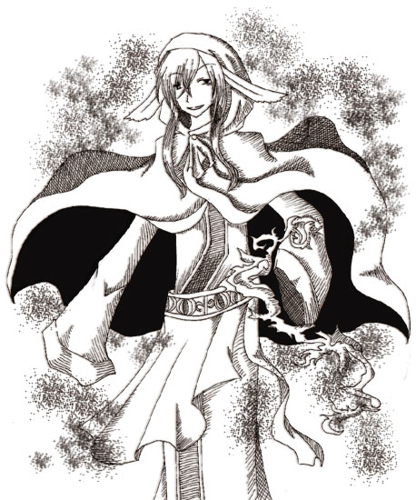 | 「とうとう、この日が来たねぇ・・・。」 蝋燭に灯されたうっすらとした光の中で、立ち上がった影はその部屋から出た。 「さて、はじめるとしますかねぇ。」 その場所に響く声の主が言葉を紡げば、青白い靄のような炎が現れた。 そして、渦を巻くようにして、次第に形をつくっていく。 「月をこの中に・・・。」 言葉のままに、つくられた鏡に月が映った瞬間、空から二つの月が姿を消した。 そして、鏡の中にうっすらと二つの月が『映っていた』。 その者は鏡の中へと腕を沈めていった。まるで水面に手を入れていくように、簡単に沈めていく。 すーっと、引き上げられた手には月が持っていた石を手に持っていた。 鏡は紅い鎖に固定され、その場所に封印された。空の月ごと封印し、その日から月は昇らなくなった。 そして、その者が手にした石は少しずつ形を変え、大きな一つの目に翼と尾をつけた魔物と成り代わった。 「さて、厄災をばら撒くときが来ましたねぇ。・・・我と対なる紅の者は止められるのでしょうかねぇ?」 クスクスと口元に浮かべる笑み。 その者はそのまま影の中に潜み、その場から姿を消した。 ![]() あとがき 紅と蒼の月人の絵にいた兎さんです。 これにつけた話的には悪い人っぽいですけど、悪い人じゃないです。 ちなみに、こっちが蒼月さんで狐さんの方が紅月さんです。 結構最初はほとんど顔だけだったのですが、気に入ってるキャラだったりします。 物語を書く気はないのですが、なんかこっそり書いてそうです。 悪い人じゃない理由とか書かないと、このままじゃ悪い人のレッテル貼られそう(苦笑 |