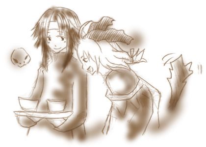 ◆おいしい食事 ことことこと・・・ よい香を漂わせる鍋の蓋が中の蒸気によって動いて音を立てる。 「〜♪」 その音に紛れ、微妙に音が外れた音楽が聞こえてくる。否、そこにいる者の鼻歌だった。 中の空気はその鼻歌とともに、おいしそうな香を周囲に漂わせ、外に流れていった。 「おう、今日はシチューだな。」 「そうだよ。今日は寒いからね。」 側に教会にはある意味あるのだろうけれど似あわないドクロがカチカチと歯を鳴らせて口を聞いた。 普通の人なら驚くだろうが、これはクロと言い、立派なこの教会の住人だった。 だから、ここにいる二人は驚くことなどしないし、そもそもクロはシアンの大事な友人なのだ。 調理しているシチューをオタマで混ぜ、味を確認して再び蓋をした。クロにドレッシング出してと頼み、シアンは側に並べた皿に千切った葉野菜と切った野菜を綺麗に盛りつけた。 そんな変な組み合わせでありながら、なごやかに調理が進められていた。そこへ第三者が現れた。 「今日は何だー!」 ![]() シアンとは正反対に大きく活気のある声が聞こえ、その人物が中に入ってきた。両腕には薪を持っていることから、調理で使う用にと持ってきてくれたのだろう。 「シチューか。」 「そうだよ。今日は寒いから鍋物がいいなと思って。」 「そうだな。」 耳はぴょんと立ち上がり、ふさふさの尾が待ち遠しいのかうれしいのか、ゆらゆらと揺れている。 シアンはわかっていてもまだ成れず、また顔を下に向けたり顔を背けたりしてしまった。しかも、最後の方はぼそぼそと声も小さくなった。 これが嫌われる原因であり、黒いマントのようなものを羽織っている故、死神と呼ばれ忌み嫌われてきた。 実際、死人の声を聞いたり見た光景を見れる事から死神に違いないと自分でも思ってしまうぐらい。 だから、気をつけようと思うのに、どうしてもやってしまう。 「お前は本当何でも料理はうまいよな。」 だけど、目の前の彼は目線をはずしてもそうやって笑顔を向けて言ってくれる。 この教会の住人全員がそうで、彼もまたそうやって自分の料理を素直においしいと言ってくれる。 そんな些細な事だが、シアンにはとてもうれしい言葉だった。 「げっ、もうこんな時間だ。」 今日も夕食楽しみにしてるからなと、またなと手を振ってフェウスは嵐のように去っていった。 ここは本当に、あの町とは違って、自分を見てくれる人がいる。 「良かったな。」 クロはシアンを見上げて話しかける。シアンはただうなずいて、笑った。 後少し手を加え、すでに用意しておいたデザートを皿にとりわけ、台に乗せて食堂へと向かった。 シアンなりのお礼として、気付いてもらえていないだろうが、フェウスの食事の量は少し増やしていた。 ふふっと、クロスはたまに目が合うと笑うのでたぶんばれているだろうが・・・。 フェウスは結構よく食べるので、もしかしたらあれぐらいが普通で丁度いいのかもと思いながら今日も量を増やして満足するシアンなのだった。 ++++++++++ ◆教会での懺悔 静まり返る教会の中で響く声。 「どうか我等に神のご加護をお与え下さい。今日も無事一日が終わりますように・・・」 神に祈る少女。まさに神に使えるシスターの姿だった。 カタッ 静かな教会内に響いた小さな音。 「祈りは終わりました。・・・さぁ、行きましょう」 少女は先程の音で誰か来たのを感じ、またそれが誰であるのかわかっていた。 立ち上がり振り返って相手の目は隠されて見えない為、見えているであろうその先を見据え視線を向ける。先程祈りを捧げていた時のような危うさは一切見せなかった。 「まだ声もかけてなかったのにぃ。」 陽気な口調で何でわかったのさと不満の色を見せる声が聞こえる。 「わかっちゃうなんて、そろそろ俺も役立たずになっちゃうかなぁ?」 冗談交じりで青年はそういいながら、口元は笑っていた。きっと、目も見えていたら笑っていただろう。不敵な笑みという奴で。 「いえ、そんなことありませんよ。」 視界は隠されていながらも、全て「見えている」であろうクウの「目」を見ないように顔を逸らす。 「私は教会の皆さんとそれ以外の方という違いしかわかりませんから。」 だから、何度も思い出して悔やんでしまう。 「私はクウさんのように、「生きているものの気配」しかわからないのですから。」 何度、あの日を後悔しただろう。どうして気付けなかったのだろう。人ではない、人の「生命」ではないものが近づいたことに。 「貴方が日常として『見える』というその『世界』がうらやましいとは思いません。それもまた辛く悲しいものすら映してしまうとわかりましたから。」 そう、何度その「目」が欲しいと願っただろう。そして、一度クウやシアンを通して「見えた」ものはとても辛く悲しく楽しい光景ではなく、「見る」という行為がそして世界にはあってはいけない「間違い」なのかもしれないとも思った。 「でも、縋りたく