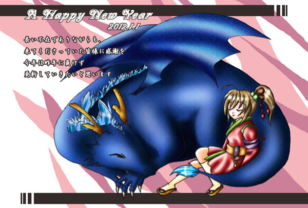 12年度辰年賀絵-世鷲とゆう 思ったより世鷲の色が濃くてわかりにくくなってしまった(汗 ちょうど干支じゃん!と思って描いてみたものの、思ったより手間取りました どうも、和風より洋風の方がドラゴン描くのは苦手のようです
