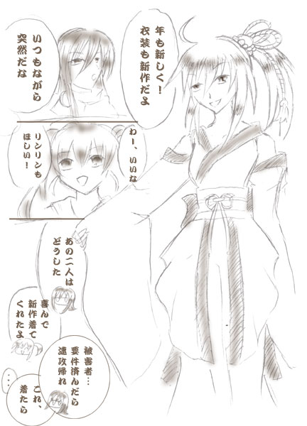 | 年末も賑やかに終わっていった幻神楼。 年をあけても賑やかは変わらず。 そんな矢先にやってくる訪問者もまた、相変わらずである。 ![]() 結局、訪問者の望み通り、持ち込まれた衣装を着る羽目になった。 来年からは、出入り禁止の札でも張るかと、少しだけ思った。 けれど、凛々が楽しそうならいいかと思うところがまた、館主の親馬鹿が今年も変わらないという証明かもしれない。 私は、そんな日々がこれからも続くことを願い、明日もこの場に座る。 ○月×日 日誌―執筆者 寧爛 あとがき 一枚漫画もどき。あまり変化ないけど、少々変わったゆうの衣装。 元のものは落書きであるので参考にどうぞ。 世鷲と田所は今頃へこんでたりするけど、誰も見ていないので謎扱い。 一番冥鎌が綺麗に似合ってたとゆうの感想まで書くつもりでしたが、 日誌になったので、ボツに。 |